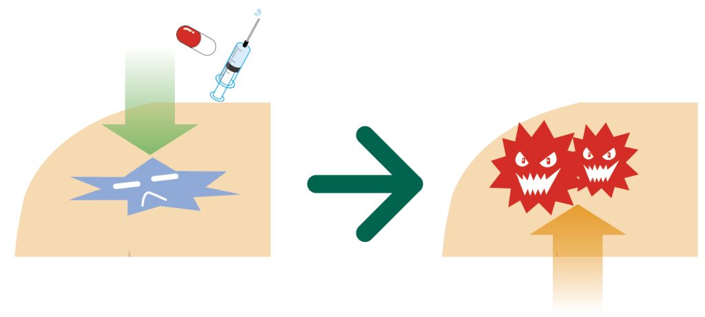 病院などは、痛みや不調の原因を『薬や注射で押さえ込む』治療をします。